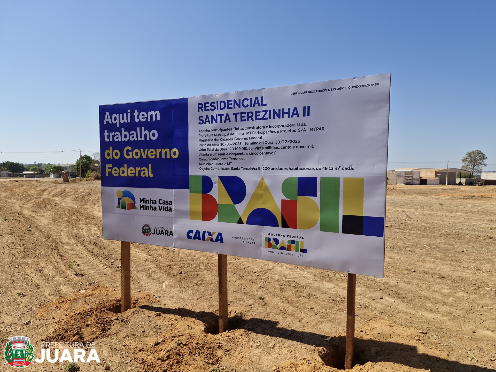 A empresa responsável pela execução é a Tottal Construtora e Incorporadora Ltda, que já está praticamente instalada no canteiro de obras. A Prefeitura de Juara tem garantido toda a assistência necessária, realizando a limpeza completa da área, colaborando com o nivelamento do terreno e assumindo também a execução da infraestrutura do conjunto.